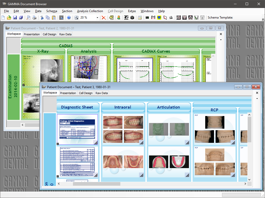 The GAMMA Document Browser is a comprehensive database and documentation tool. In addition to the classical Gamma modules for diagnostics, it aggregates complete photo documentations as well as any existing documents, such as text files, graphics and spreadsheets. The option for easy and direct presentation of data makes this program an excellent communications tool which is suitable equally for students, in the dental office, or in the dental lab.