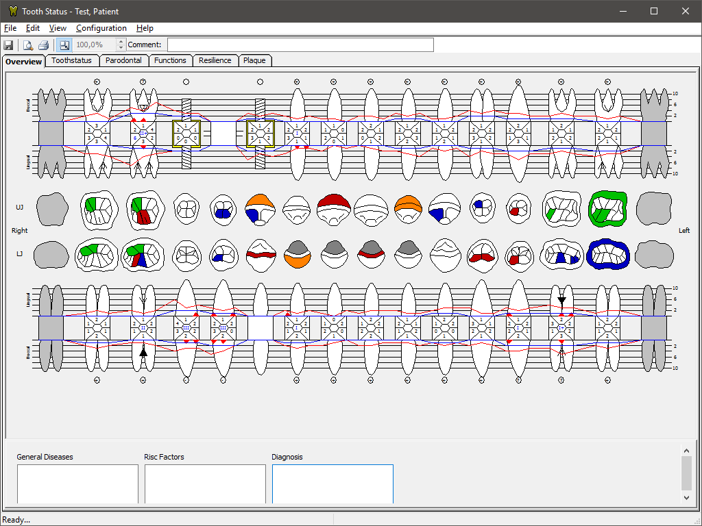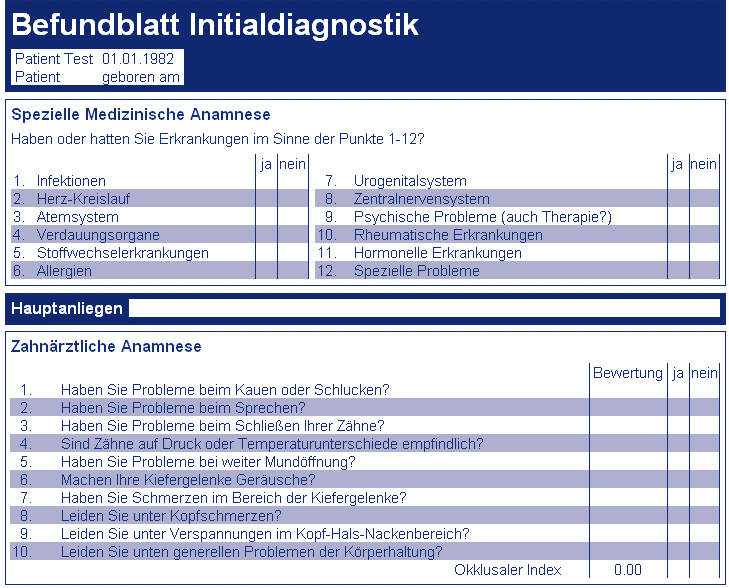 Calculation of the occlusal index is automatically carried out based on the inputs in the dental anamnesis. It reflects the patient’s own subjective feelings, regarding his/her complaints. A comparison of the subjective and objective situation is a key to evaluation.